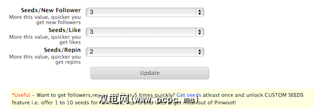 Pinwoot服务围绕一种“种子"货币。首先,您要在帐户中存入35粒种子,这意味着您的帐户有足够的货币可让您获得15-25个新的关注者,对您的图钉喜欢或喜欢。例如,当一个新朋友跟随您时,您将损失3粒种子。