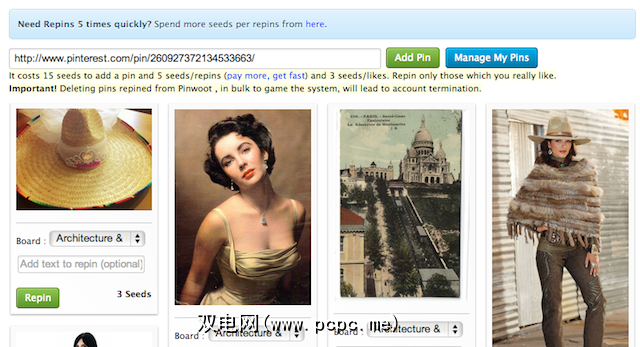 获取更多种子的一种快速方法是重新固定其他人的内容,这就是Pinwoot故意限制用户每月仅进行35次复制的原因。
