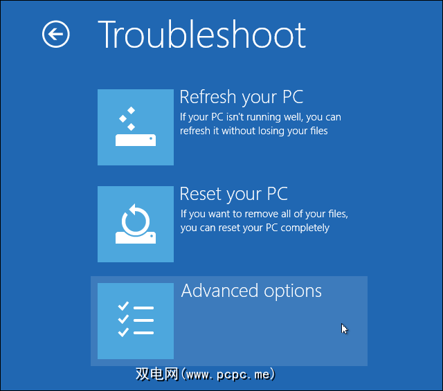 单击“故障排除"屏幕上的“高级"选项磁贴,以跳过基本的“刷新"和“重置"选项。