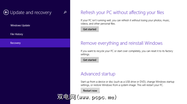 这些环境并不是进入安全模式的唯一途径。 “ PC设置"应用中还有“高级启动选项"菜单的快捷方式。按Windows键+ I,然后单击“更改PC设置"将其打开。单击“更新和恢复",单击“恢复",然后单击“高级启动"下的“立即重新启动"按钮。