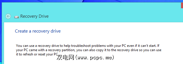 您还可以从任何Windows 8.1或Windows 8 PC创建USB恢复驱动器。为此,请在Windows 8或8.1 PC上按Windows键,在“开始"屏幕上键入 Recovery Drive 进行搜索,然后打开“创建恢复驱动器"工具。