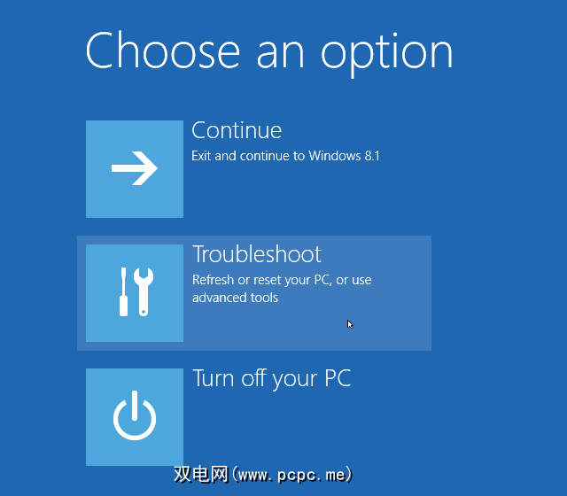 插入将USB恢复驱动器插入Windows 8 PC并从中重启。它将提供可用于帮助排除PC故障的选项以及安全模式。如果您的启动加载程序已完全损坏,甚至不带您进入此屏幕,这将非常有用。如果周围有Windows 8或8.1安装介质,则也可以从那里引导,而不使用USB恢复驱动器。