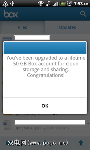 要利用Box.net存储升级交易,请在Android智能手机或Android平板电脑上安装Box.net应用程序的最新更新。登录或注册新帐户后,您将立即收到50GB升级的通知。