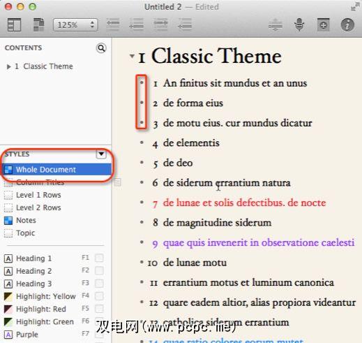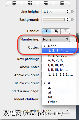 OmniOutliner最喜欢的功能之一就是自动编号功能。通过单击“样式"侧栏中的整个文档,可以轻松地为列表或任何大纲中的项目编号。现在在检查器中,选择编号,然后从下拉列表中选择 1、2、3、4 ... 顺序。
