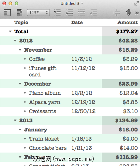 OmniOutliner可以处理更复杂的轮廓线,不仅包括顶级行和子级别,还有可以计算和处理数据的列。
