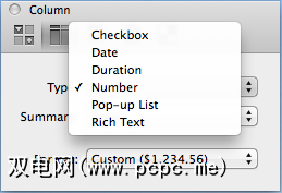 在文档中添加列之后,可以选择它,然后使用检查器来指定要格式化的数据类型列。这类似于在Excel中使用公式完成的方式,并且列可以包括复选框,日期,弹出列表,数字和总计以及富文本。