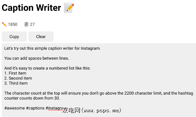 撰写标题后,请点击复制按钮,转到Instagram,然后将其粘贴到此处。下次要再次使用Caption Writer时,请点击清除以重新启动。无需登录或下载任何内容,它是一个免费且令人敬畏的精美工具。