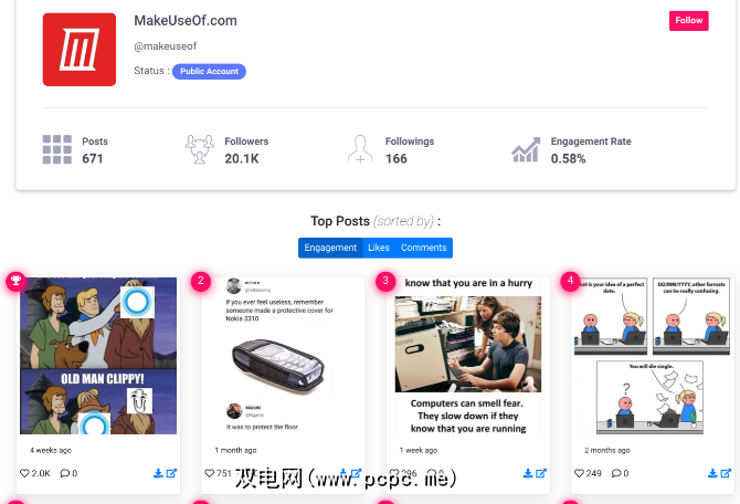 键入任何Instagram公开个人资料的用户名,或浏览有关体育品牌,科技品牌,顶级用户等的建议。几秒钟内,Top 100 Posts将显示该帐户的最佳照片和视频(不包括故事)。
