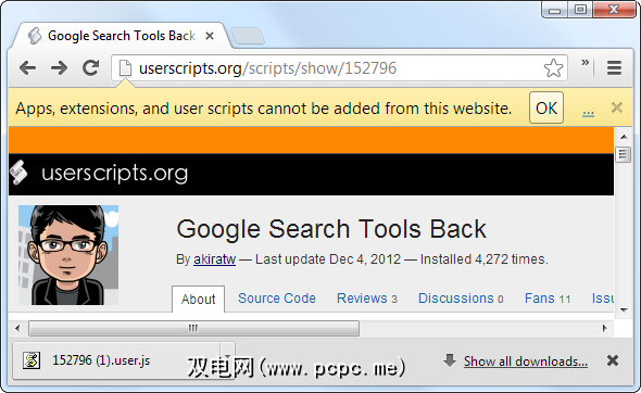 要安装Google Search Tools Back用户脚本,请访问其网页并单击绿色的“安装"按钮。如果您使用的是Firefox,系统将提示您安装用户脚本,而不会出现任何问题。如果您使用的是Chrome浏览器,则会看到一条消息,提示您无法从该网站安装脚本,并且.user.js文件将下载到您的计算机中。