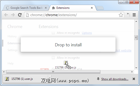 要安装用户无论如何,请单击脚本按钮,指向工具,然后选择扩展。将.user.js文件从下载栏中拖放到扩展程序页上进行安装。