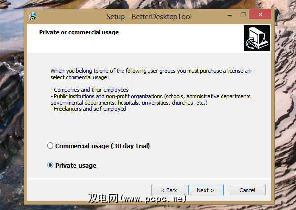 是否准备好查看BetterDesktopTool?前往BetterDesktopTool.com,然后单击``下载''。在安装过程中,系统会询问您是出于个人原因还是出于商业原因使用该应用程序: