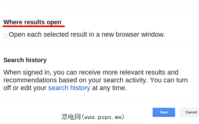 如果您使用的是Google,请点击搜索结果页面右上角附近的齿轮图标,然后选择搜索设置从出现的下拉菜单中。导航到打开结果的地方,然后选中该框以在新窗口中打开选定的搜索结果。文本具有误导性,因为结果会在新的 tab 中打开。