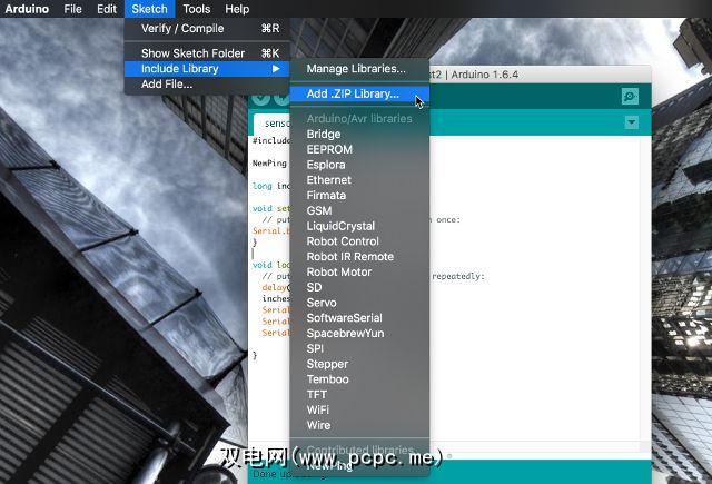 制作确保您在草图的顶部看到include语句;如果不是,请点击素描>包含库> NewPing 。完成此操作后,加载以下草图:
