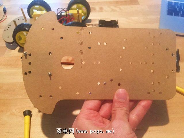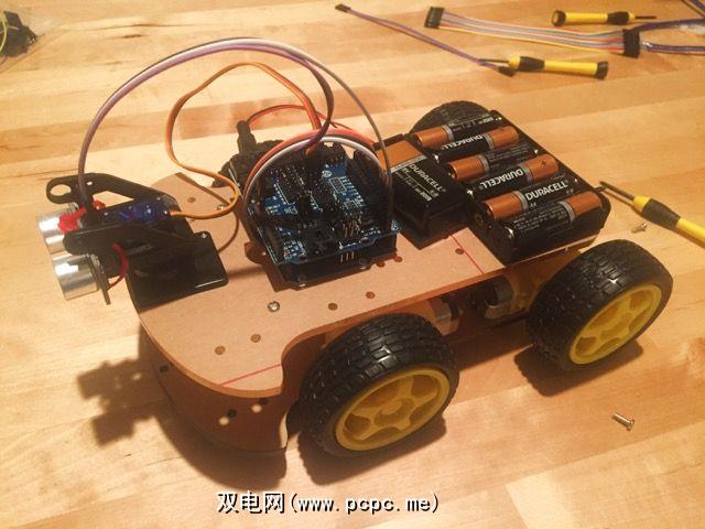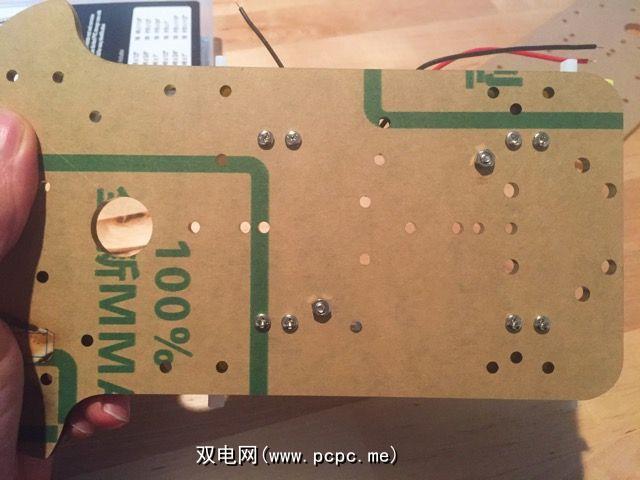 现在,使用四个短螺钉将机箱的上部连接到铜轴上。将六节AA电池座放在机箱顶部(如果可能的话,将其向下拧),将9V电池座连接到Arduino,此机器人就可以晃动了!