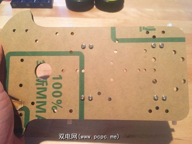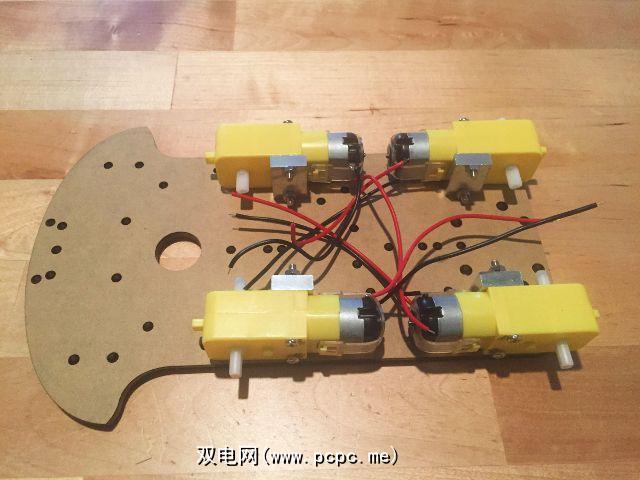 我发现我必须从电动机电线上剥去一些外壳才能使其正常工作。现在您已经将电动机和电源全部连接好,将车轮滑到电动机驱动轴上,并在下图所示的位置安装四个铜轴(每个铜轴需要一个小螺栓)。该机器人开始成形!