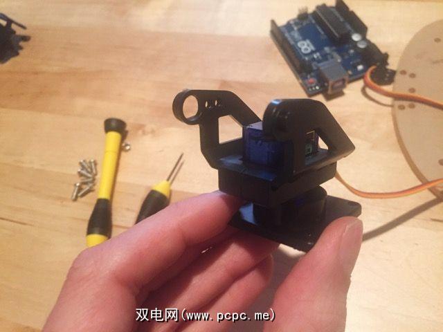 下一步需要微型伺服器,黑色横档,伺服支架(由三个黑色塑料块组成)和一些小螺钉。使用工具包中较大的尖头螺钉之一将黑色横档固定到微型伺服器上: