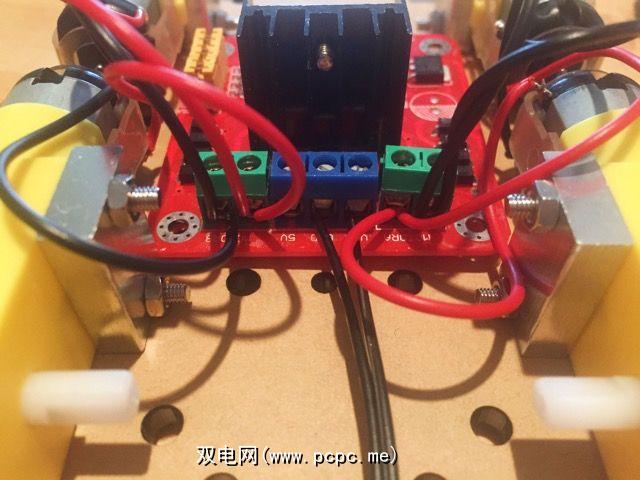 下一步是将H桥(在我的套件中为红板)固定至机箱。 。您可能要等到所有电线都连接到H桥之后再执行此操作,但这取决于您(我发现这样比较容易)。快速说明:我的工具包缺少许多紧固件,因此我用电工胶带固定了桥。但是,您可以在此处看到螺栓和螺母的去向: