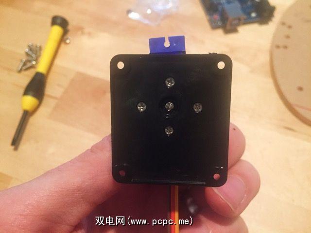 然后将伺服器上下翻转到支架的黑色塑料环中。确保从伺服器引出的电线与支架的较长部分朝向相同的方向(再次参见下图),并使用四个细小的螺钉固定横杆(支架上有四个孔,