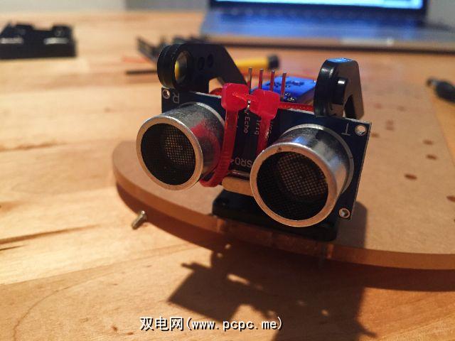 是时候给我们的机器人一些眼睛了。使用两个拉链将超声波传感器连接到伺服器支架上。