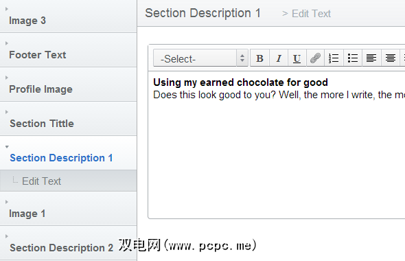 根据您选择的类别和名称,Breezi尝试用有意义的文本填补空白。您仍然可能要更改图像以及图像,字体大小等。在新Breezi页面中编辑元素就像单击它们一样简单。键入新文本,交换图像(使用内置的图像编辑器来增强图片),然后在周围拖放元素以更改其位置。