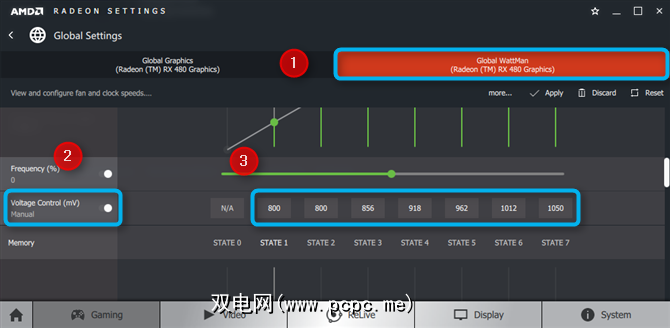 因此,对于状态1至状态7,我将电压降低了100。RX480的最低电压为800,所以您将请注意,前两个条目位于800: