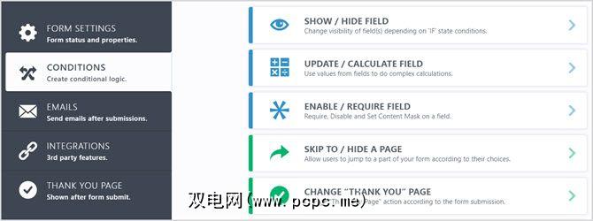 下一步,请检查条件区域,您可以在其中创建条件逻辑。示例包括显示或隐藏字段,更新或计算字段以及跳过或隐藏页面-全部基于条件。