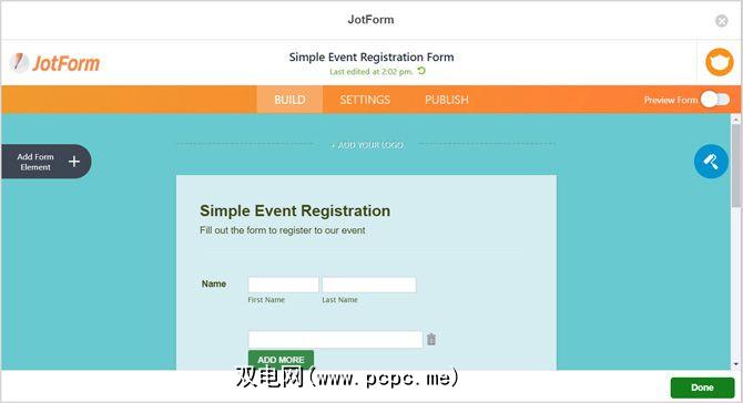 JotForm Builder的顶部有三个选项卡,用于“生成",“设置"和“发布"。从 Build 标签开始,您可以重新排列元素,调整元素属性,添加新元素并使用“表单设计器"对表单进行样式设置。