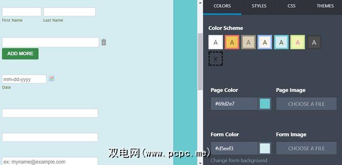要打开“表单设计器",请单击右上方的油漆滚筒按钮。您有多种选择,可以使您的表格更具吸引力。选择页面,表单,字体和背景的配色方案或特定颜色,或上传自己的图像以得到个性化的外观。