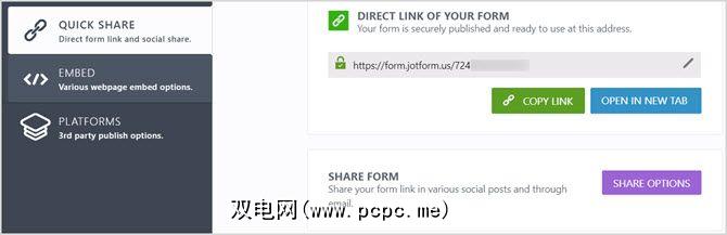 最后一个选项卡发布是准备好表单时要使用的位置分散式。您可以选择快速共享,它为您提供表单的链接以及社交媒体共享选项。