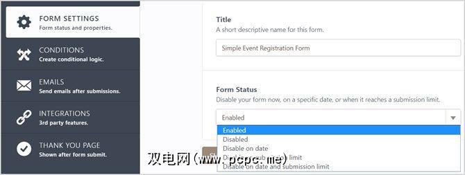 >设置标签为您的表单提供了多个选项,分为五个部分。首先是常规的表单设置,您可以在其中为表单命名,并从“启用"或“禁用"中选择一个状态。 “禁用"选项包括日期和/或提交限制,或两者兼有。
