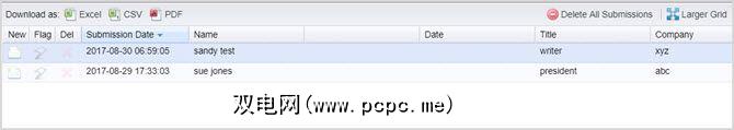 从此处,您可以浏览各个提交内容,进行打印一个(如果需要),或将其下载为PDF。如果您滚动提交下方,您将看到一个列出所有提交的表格。从那里您还可以将它们下载为PDF,CSV或Excel格式。