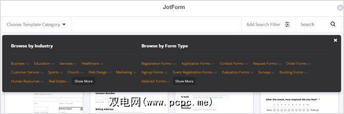 JotForm提供了 7,500个模板供您选择,因此您应该能够找到所需的东西。您可以按行业或类型浏览模板。从商业和房地产行业到调查和联系表类型,这些选项都很广泛。