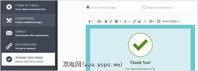 设置中的最后一部分是谢谢页面。您可以启用它或将其重定向到外部链接。如果启用它,则可以在简单的编辑器中自定义文本和外观。