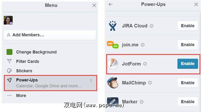 要开始使用Trello的JotForm,请登录到Trello帐户。选择要添加JotForm的面板,然后单击右上角的 Show Menu 。选择加电,然后滚动到列表中的JotForm。单击启用并登录到您的JotForm帐户。