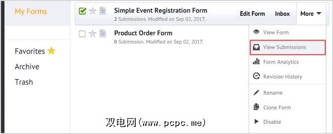 尽管您可以在不离开Trello的情况下快速轻松地构建表单,但必须访问JotForm以查看您的回复。前往该网站登录,您将立即看到您的表格列表。然后,选择您的表单,单击更多按钮,然后选择查看提交内容。