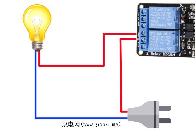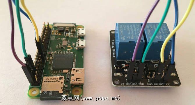在连接之前请先关闭并拔下Raspberry Pi点亮继电器的灯光。使用继电器板上的常开(NO)连接器代替常规开关,如下所示: