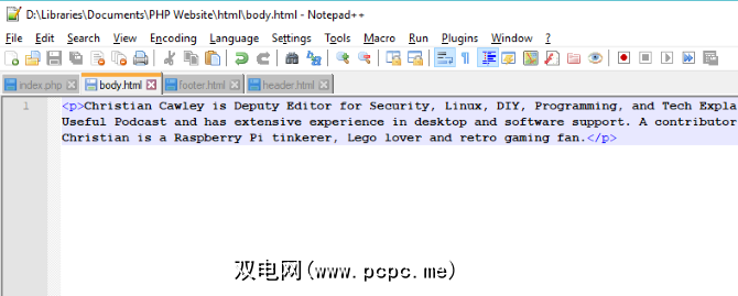 <?php echo file_get_contents("html/header.html"); ?><?php echo file_get_contents("html/body.html"); ?><?php echo file_get_contents("html/footer.html"); ?>保存,上传到您的服务器,然后浏览到index.php。您应该在浏览器中看到完整的网页。请记住,您在浏览器中打开的实际PHP文件仅由三行组成。
