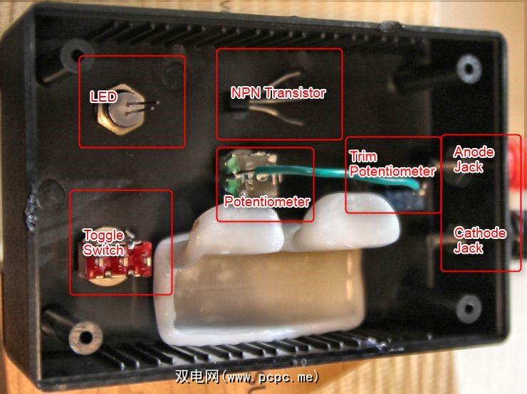 两个香蕉插头都位于项目框的顶部。此步骤无需太多努力。只需在盒子顶部钻两个孔,然后取下插头上的螺母并插入。然后,您将使用凸耳螺母将设备拧紧到位。唯一的例外是NPN晶体管和微调电位器,您可以将它们热粘合到位。