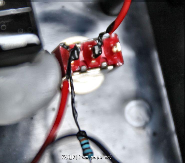 在正极引脚上,将连接焊接到NPN晶体管的基极引脚(中央引脚)。在LED正极引脚的中间,焊接拨动开关上的3.3k电阻器。
