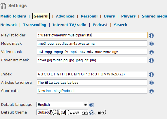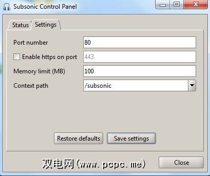 单击“ 设置"选项卡以设置服务将使用的服务器端口以及路径。 Subsonic应该从那里运行。