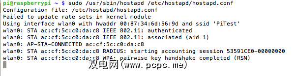 sudo /usr/sbin/hostapd /etc/hostapd/hostapd.conf您的 PiTest 网络应该现在正在广播,假设您没有更改名称。尝试从另一台机器或移动设备连接,您应该会在屏幕上看到一些调试信息,例如: