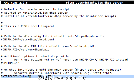 sudo nano /etc/default/isc-dhcp-server更改最后一行,使其显示为:
