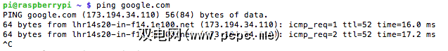 ping google.com,检查Pi是否可以访问Internet(不在您的本地计算机)。您应该看到类似这样的内容: