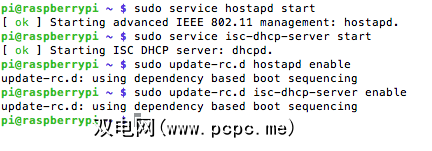 sudo service hostapd startsudo service isc-dhcp-server startsudo update-rc.d hostapd enablesudo update-rc.d isc-dhcp-server enable