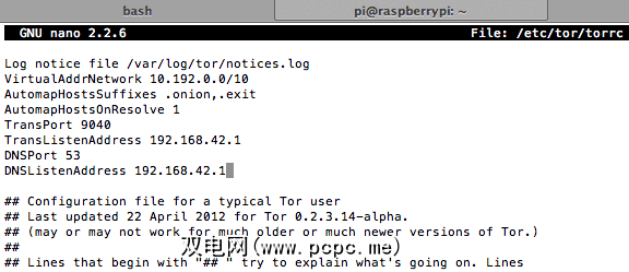 Log notice file /var/log/tor/notices.log VirtualAddrNetwork 10.192.0.0/10AutomapHostsSuffixes .onion,.exit AutomapHostsOnResolve 1 TransPort 9040 TransListenAddress 192.168.42.1 DNSPort 53DNSListenAddress 192.168.42.1