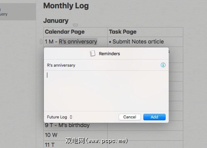 通过向Bullet Journal条目添加提醒 >文件>共享>提醒选项。也就是说,如果您在任务或事件到期之前需要精神上的推动。您需要编辑提醒名称和说明文字。这些字段默认显示便笺的名称和内容。