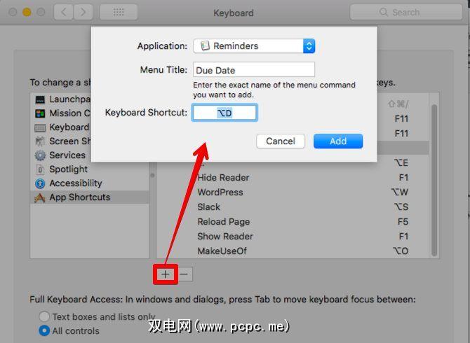 为。您可以通过系统偏好设置>键盘>快捷方式>应用程序快捷方式来执行此操作。假设您要创建一个快捷方式,以按截止日期对条目进行排序。以下是您需要在应用程序快捷方式中添加的详细信息: