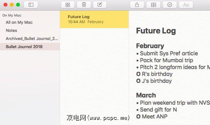 为项目符号日记创建专用文件夹。为了避免事情变得一发不可收拾,每年设置一个,然后在一年结束后,在文件夹名称前加上文字 _Archived 。为“将来的日志"添加一个注释,并每月将其格式化为标题。现在,照常填写您的任务和事件。