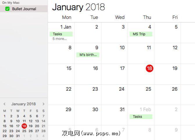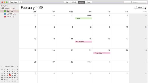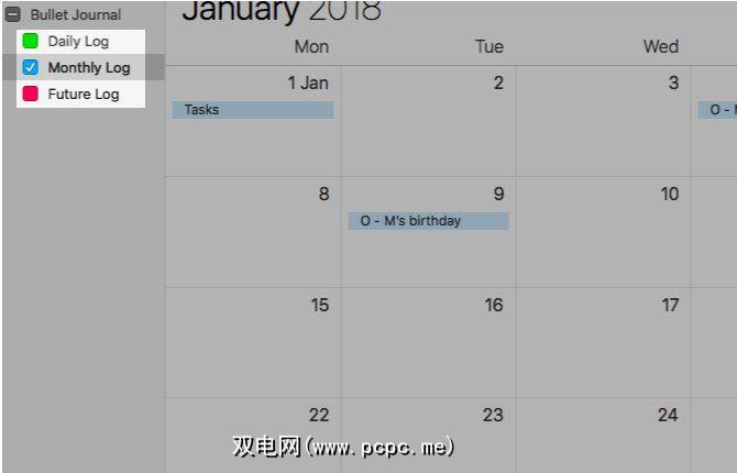 “月"视图充当“月日志"和“将来日志"。在每个月的第一天创建一个名为 Tasks 的新事件,并在此事件的Notes部分中列出所有每月任务。将其视为每月日志的任务页面。