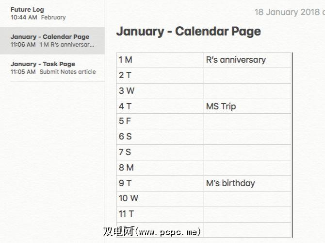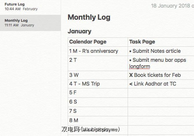 在“每月日志"列表中,安排原本会在“项目符号日志"的“日历"页面上进行的任务和事件。坚持日历日期的常用格式(即1M,2T,3W等)。对于“任务"页面上的条目,请创建提醒而不添加截止日期。